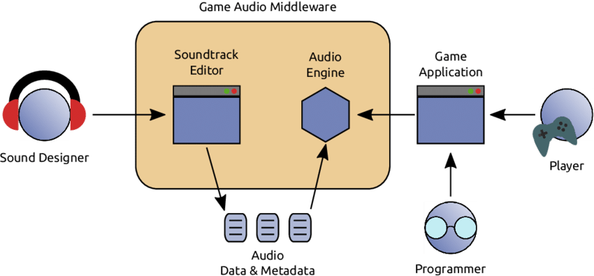 Audio Middleware là lớp phần mềm trung gian nằm giữa engine (Game Engine / Interactive Engine) và hệ thống âm thanh, giúp quản lý, xử lý và điều khiển âm thanh một cách linh hoạt mà không cần can thiệp sâu vào code. Thay vì hard-code âm thanh trực tiếp trong engine, Audio Middleware cho phép sound designer và audio developer thiết kế, chỉnh sửa và triển khai âm thanh theo thời gian thực.
