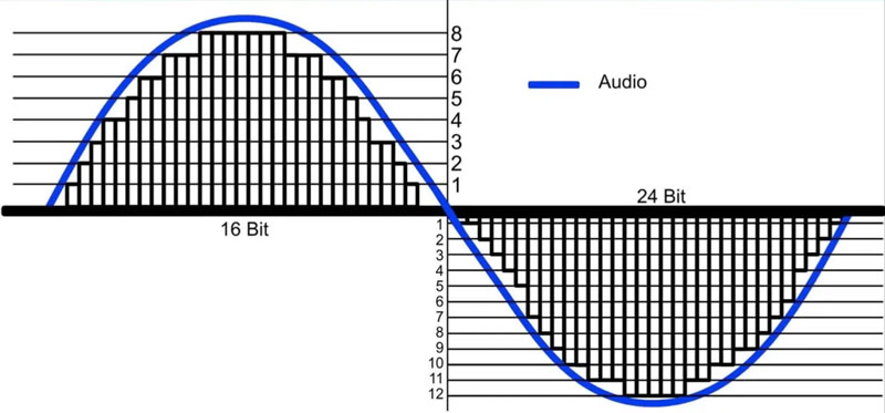 24-bit Audio: Đây là tiêu chuẩn hiện nay cho việc ghi âm và sản xuất nhạc chuyên nghiệp trong phòng thu và Audio Hi-Res. 24-bit cung cấp dải tần động khoảng 144 dB, giúp ghi nhận được sự khác biệt rất nhỏ giữa âm thanh lớn nhất và nhỏ nhất, giảm thiểu Noise Floor (nhiễu nền).