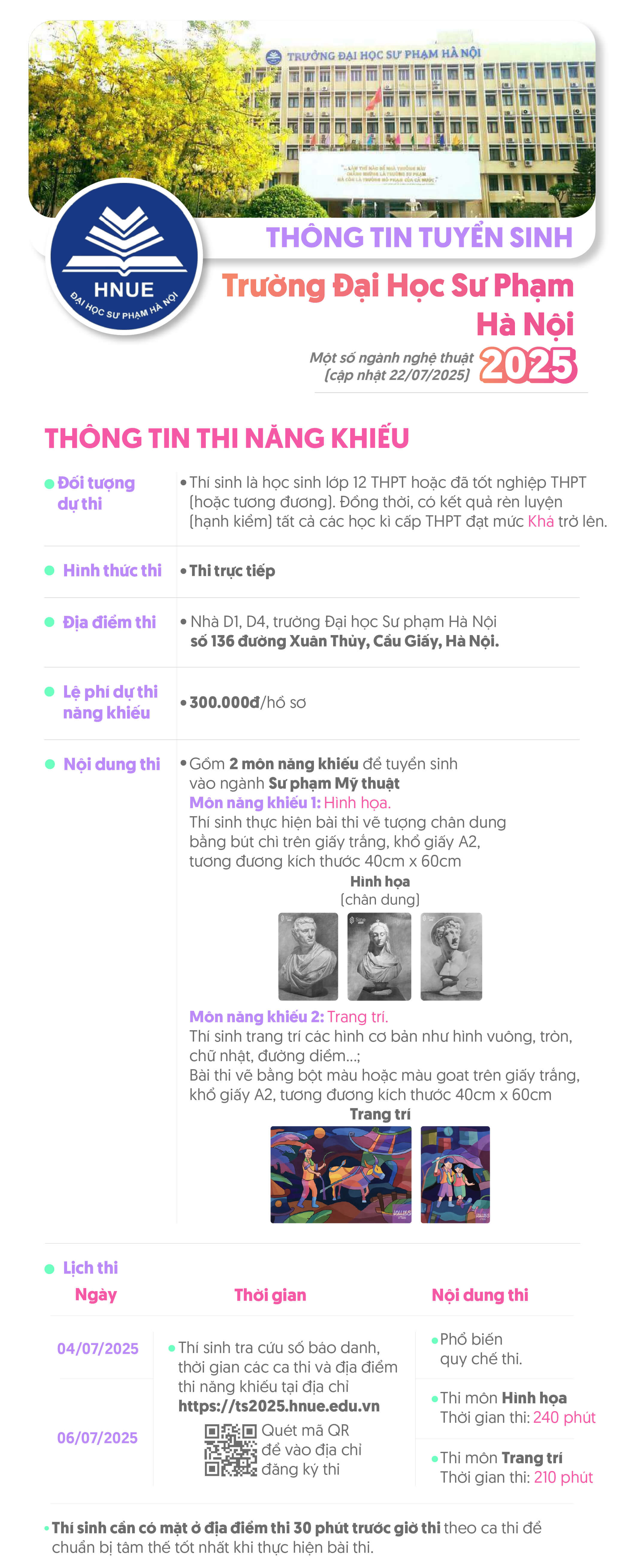 Tham khảo thêm thông tin tại: Thông tin tuyển sinh chính thức 2025 Đại học Sư phạm Mỹ thuật Hà Nội , Phương án tuyển sinh 2025 của ĐH Sư phạm Hà Nội và Kỳ thi tuyển sinh năng khiếu 2025